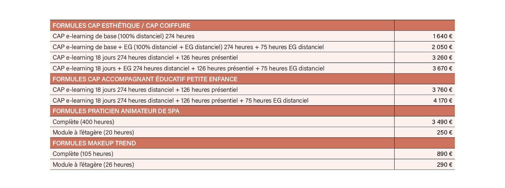 Au sein de l’École Terrade, nous proposons de réaliser votre formation du CAP Métiers de la Coiffure, le CAP Esthétique Cosmétique Parfumerie, le CAP Petite Enfance, le BP Coiffure, le BP Esthétique, la formation Makeup Trend et la formation Spa Praticien à distance. Le programme de formation et les modules de cours dispensés sont identiques à ceux proposés en présentiel au sein des écoles Terrade.
