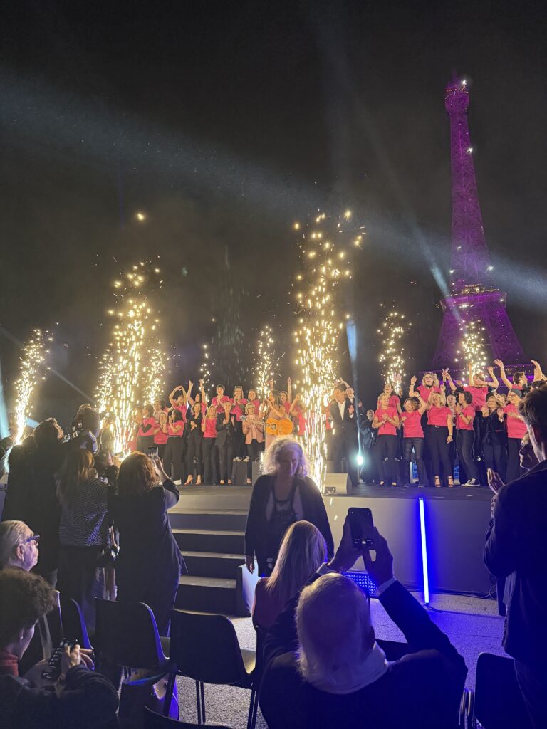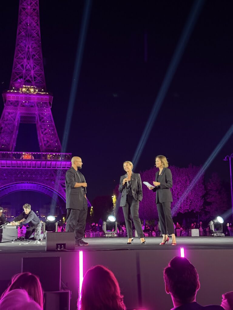 - L’illumination en rose de trois symboles parisiens : la Tour Eiffel, l’Assemblée nationale et l’Obélisque de Louxor sur la place de la Concorde, suivi de la prestation envoûtante de Keren Ann, qui a notamment interprété Paris, amour, offrant un moment suspendu d’émotion.